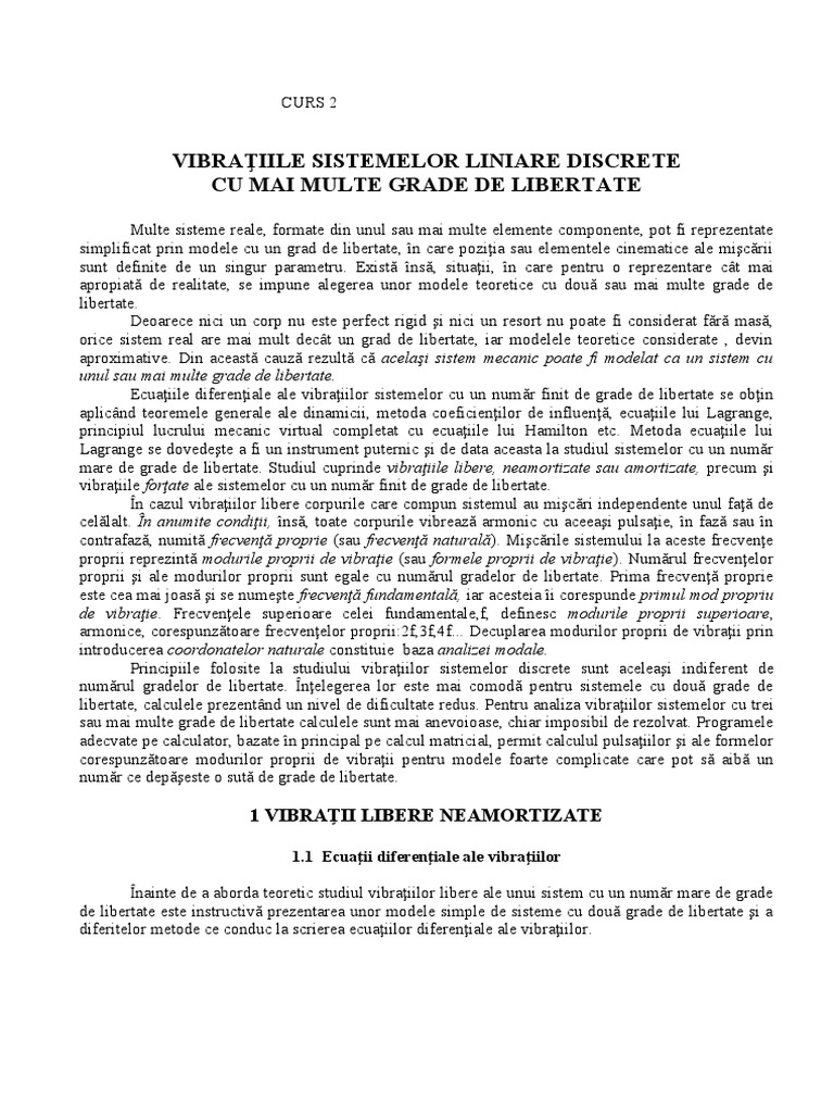 mare de grade de libertate. Studiul cuprinde vibraţiile libere, neamortizate sau amortizate, precum şi