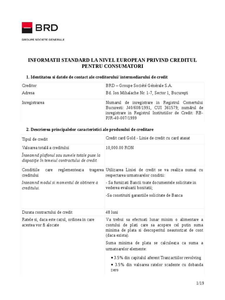 1. Identitatea si datele de contact ale creditorului/ intermediarului de credit