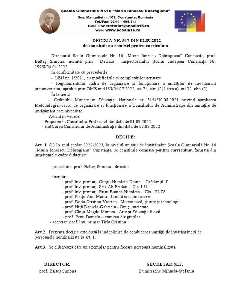 de constituire a comisiei pentru curriculum