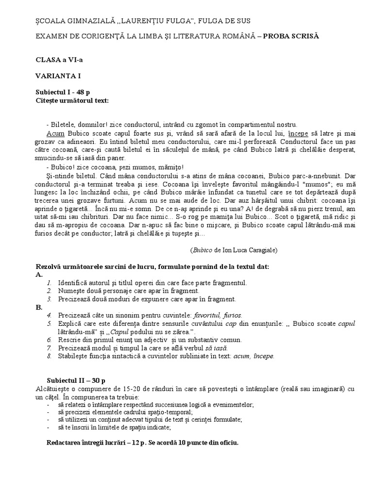 EXAMEN DE CORIGENŢĂ LA LIMBA ŞI LITERATURA ROMÂNĂ – PROBA SCRISĂ