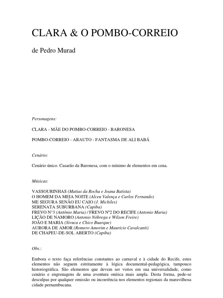CLARA: Como? No tem carta?! POMBO-CORREIO: Deixa eu olhar s mais uma vez... (olhando a bolsa) Vamos ver, vamos ver... Nada! CLARA: Nada?! Voc olhou direito? Tem certeza que ningum mandou uma cartinha, um bilhete, qualquer coisa... pra mim? POMBO-CORREIO: Nadinha! Como todos os dias: nenhuma carta pra senhorita nem pra senhora Baronesa! CLARA: (suspirando) Puxa... Mas assim no vale! Isso no justo! POMBO-CORREIO: Concordo plenamente! uma injustia terrvel fazer um pobre pombocorreio trabalhar logo hoje! CLARA: Ora! Que tem de injusto nisso?! POMBO-CORREIO: Ora... O carnaval est comeando... Todo mundo se preparando pra diverso... Vai ser uma festana daquelas! Voc me chamou aqui toa! Breve pausa. CLARA: Bem... Eu no chamei voc toa... Eu tenho uma carta pra voc... Clara entrega uma carta para o pombo que no olha o destinatrio com ateno. POMBO-CORREIO: Nossa! Ento algum ainda escreve uma carta nesse mundo? Que milagre! CLARA: uma carta muito importante. POMBO-CORREIO: (batendo continncia) s ordens, madame! Baronesa acorda, fora de cena. Tem uma voz firme, aparentando muita idade. BARONESA: (em off) Quem est a? Que barulho esse? Clara? Cad voc, menina?