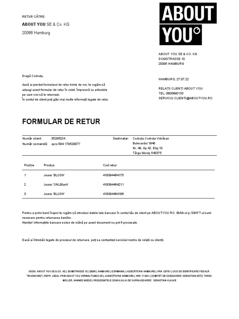 adaugi acest formular de retur în colet, împreună cu articolele RELAȚII CLIENȚI ABOUT YOU:
