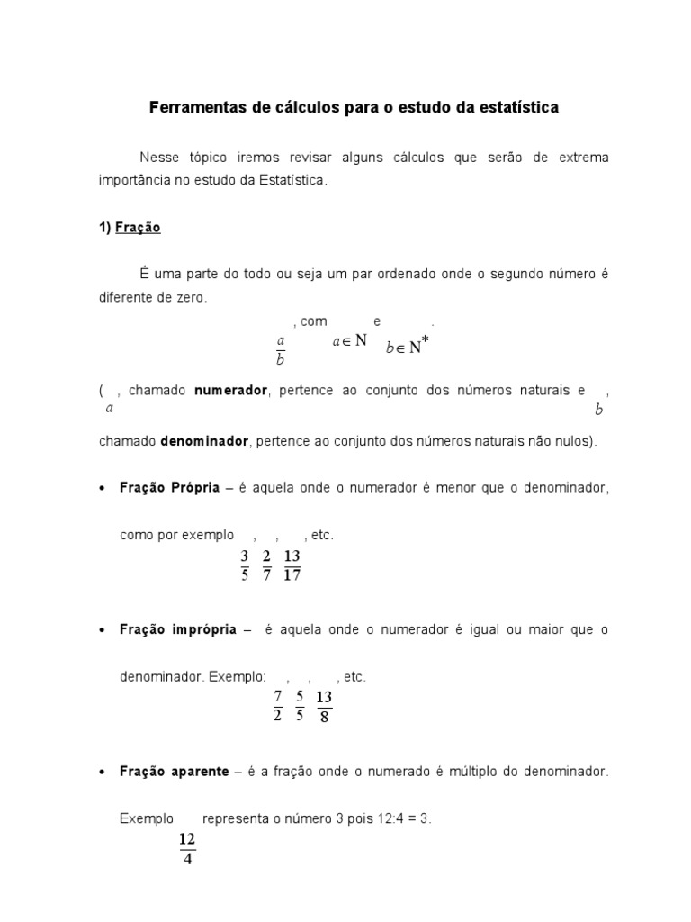 Nesse tpico iremos revisar alguns clculos que sero de extrema importncia no estudo da Estatstica. 1) Frao uma parte do todo ou seja um par ordenado onde o segundo nmero diferente de zero. , com e .