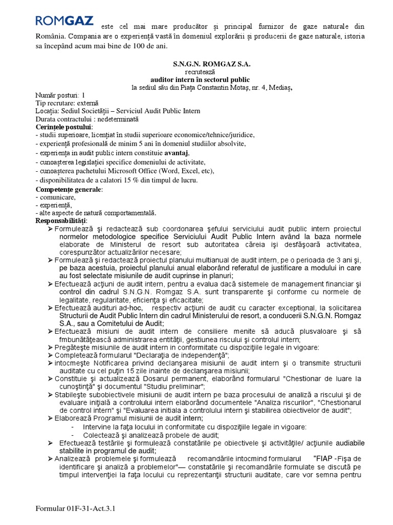la sediul angajatorului sau pe site-ul SNGN ROMGAZ SA, la butonul Carieră, unde pot fi încărcate