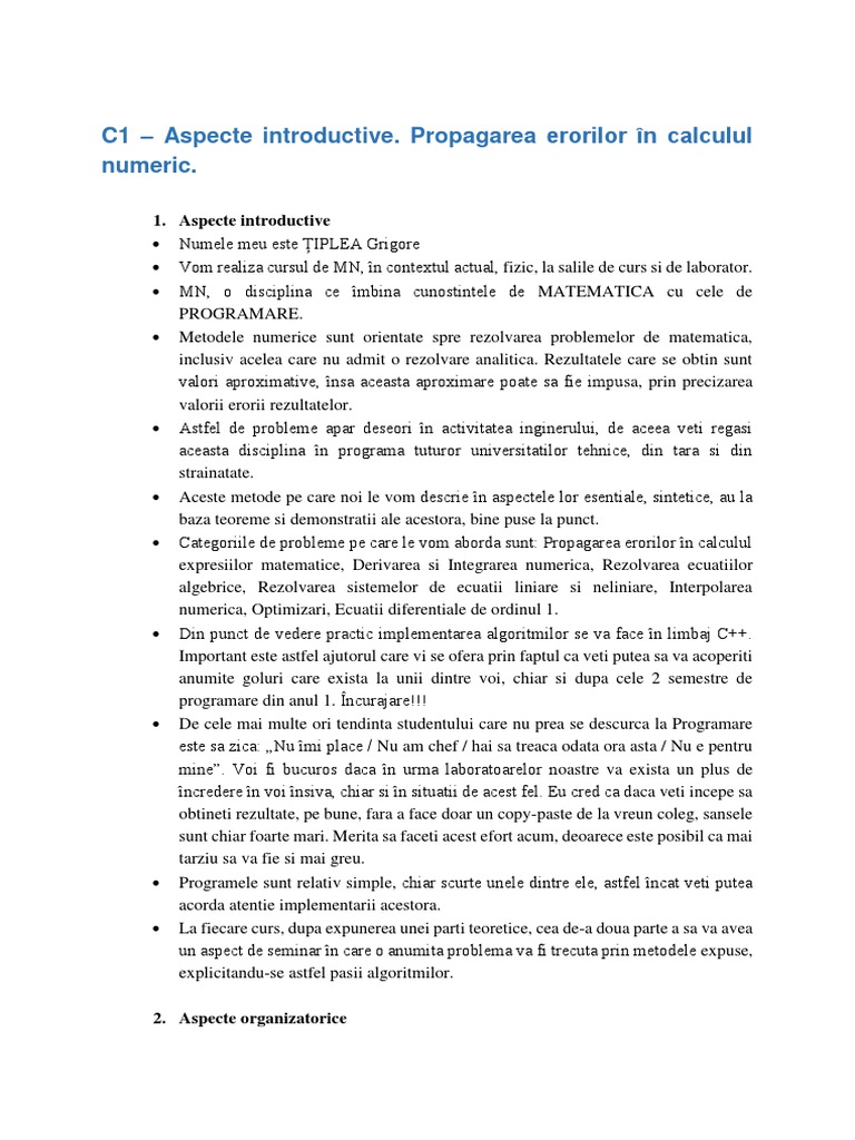 o Curs 1. Aspecte introductive si organizatorice. Propagarea erorilor în