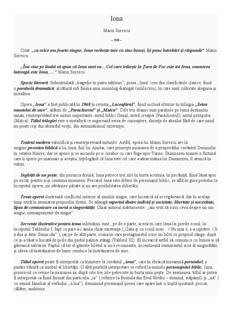 Citat: ,,ca orice om foarte singur, Iona vorbește tare cu sine însuși, își pune întrebări și răspunde” Marin
