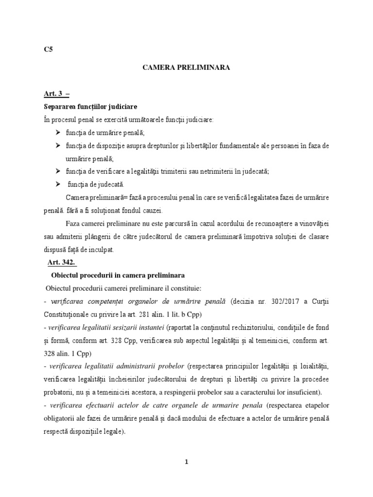 Camera preliminară= fază a procesului penal în care se verifică legalitatea fazei de urmărire