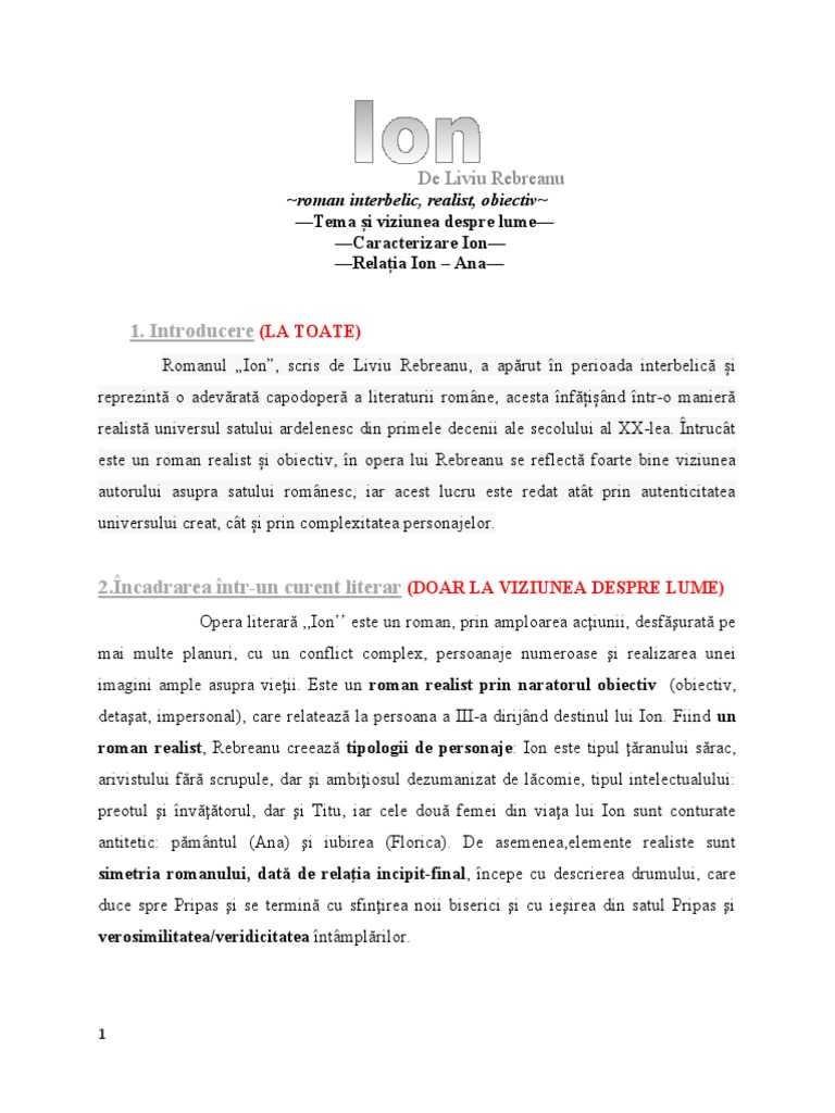 de obiectivitatea, romanul „Ion” de Liviu Rebreanu poate fi considerat un punct de