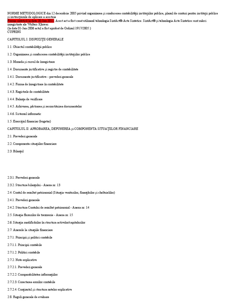 publice i instruciunile de aplicare a acestuia Forma sintetic la data 20-Jan-2011. Acest act a fost creat utilizand tehnologia SintAct-Acte Sintetice. SintAct i tehnologia Acte Sintetice sunt mrci inregistrate ale Wolters Kluwer. (la data 01-Jan-2006 actul a fost aprobat de Ordinul 1917/2005 ) CUPRINS CAPITOLUL I: DISPOZIII GENERALE 1.1. Obiectul contabilitii publice 1.2. Organizarea i conducerea contabilitii instituiilor publice 1.3. Moneda i cursul de nregistrare 1.4. Documente justificative i registre de contabilitate 1.4.1. Documente justificative - prevederi generale 1.4.2. Forma de nregistrare n contabilitate 1.4.3. Registrele de contabilitate 1.4.4. Balana de verificare 1.4.5. Arhivarea, pstrarea i reconstituirea documentelor 1.4.6. Sistemul informatic 1.5. Exerciiul financiar (bugetar) CAPITOLUL II: APROBAREA, DEPUNEREA i COMPONENTA SITUAIILOR FINANCIARE 2.1. Prevederi generale 2.2. Componenta situaiilor financiare 2.3. Bilanul