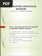 [Link].Principii contabile Elementele prezentate n situaiile financiare se evalueaz n conformitate cu principiile contabile generale, conform contabilitii de angajamente. - Principiul continuitii activitii - Presupune ca instituia public i continua n mod normal funcionarea, fr a intra n stare de desfiinare sau reducere semnificativa a activitii. Daca ordonatorii de credite au luat cunotina de unele elemente de nesigurana legate de anumite evenimente care pot duce la incapacitatea acesteia de a-si continua activitatea, aceste elemente trebuie prezentate n notele explicative. - Principiul permanentei metodelor - Metodele de evaluare trebuie aplicate n mod consecvent de la un exerciiu financiar la altul. - Principiul prudentei - Evaluarea trebuie fcuta pe o baza prudenta i n special: - trebuie s se in cont de toate angajamentele aprute n cursul exerciiului financiar curent sau al unui exerciiu precedent, chiar daca acestea devin evidente numai intre data bilanului i data depunerii acestuia; - trebuie s se in cont de toate deprecierile. - Principiul contabilitii pe baza de angajamente - Efectele tranzaciilor i ale altor evenimente sunt recunoscute atunci cnd tranzaciile i evenimentele se produc i nu pe msura ce numerarul sau echivalentul sau este ncasat sau pltit i sunt nregistrate n evidentele contabile i raportate n situaiile financiare ale perioadelor de raportare. Situaiile financiare ntocmite n baza acestui principiu ofer informaii nu numai despre tranzaciile i evenimentele trecute care au determinat ncasri i plai dar i despre resursele viitoare, respectiv obligaiile de plata viitoare. Acest principiu se bazeaz pe independenta exerciiului potrivit cruia toate veniturile i toate cheltuielile se raporteaz la exerciiul la care se refera, fr a se ine seama de data ncasrii veniturilor, respectiv data plaii cheltuielilor. - Principiul evalurii separate a elementelor de activ i de datorii - Componentele elementelor de activ sau de datorii trebuie evaluate separat. - Principiul intangibilitii - Bilanul de deschidere pentru fiecare exerciiu financiar trebuie s corespunda cu bilanul de nchidere al exerciiului financiar precedent. - Principiul necompensrii - Orice compensare intre elementele de activ i de datorii sau intre elementele de venituri i cheltuieli este interzisa, cu excepia compensrilor intre active i datorii permise de reglementrile legale, numai dup nregistrarea n contabilitate a veniturilor i cheltuielilor la valoarea integrala. - Principiul comparabilitii informaiilor - Elementele prezentate trebuie s dea posibilitatea comparrii n timp a informaiilor. - Principiul materialitii (pragului de semnificaie) - Orice element care are o valoare semnificativa trebuie prezentat distinct n cadrul situaiilor financiare iar elementele cu valori nesemnificative dar care au aceeai natura sau au funcii similare trebuie nsumate i prezentate intr-o poziie globala. Un element patrimonial este considerat semnificativ daca omiterea sa ar influenta n mod vdit decizia utilizatorilor situaiilor financiare. - Principiul prevalentei economicului asupra juridicului (realitii asupra aparentei) - Informaiile contabile prezentate n situaiile financiare trebuie s fie credibile,s respecte realitatea economica a evenimentelor sau tranzaciilor, nu numai forma lor juridica. Abaterile de la principiile generale prezentate mai sus pot fi efectuate n cazuri excepionale. Astfel de abateri trebuie prezentate n notele explicative, precum i motivele care le-au determinat, mpreuna cu o evaluare a efectului acestora asupra valorii activelor, datoriilor, poziiei financiare i a rezultatului patrimonial. [Link].Politici contabile Aplicarea prezentelor reglementari contabile presupune stabilirea unui set de proceduri de ctre conducerea fiecrei instituii publice pentru toate operaiunile derulate, pornind de la ntocmirea documentelor justificative pana la ntocmirea situaiilor financiare trimestriale i anuale. Aceste proceduri trebuie elaborate de ctre specialiti n domeniul economic i tehnic, cunosctori ai specificului activitii desfurate i ai strategiei adoptate de instituie. La elaborarea politicilor contabile trebuie respectate principiile de baza ale contabilitii de angajamente. Politicile contabile trebuie elaborate astfel nct s se asigure furnizarea, prin situaiile financiare, a unor informaii care trebuie s fie: a)relevante pentru nevoile utilizatorilor n luarea deciziilor economice; si