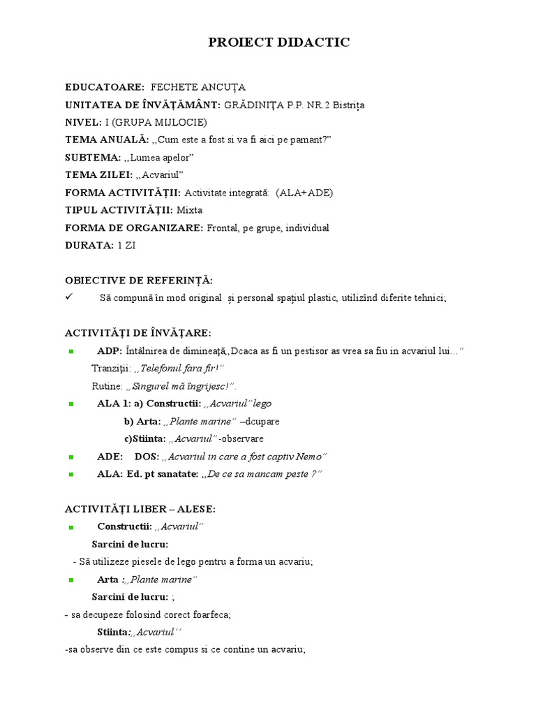 Material didactic: acvariu, lego, foarfeci,hartie glasata avand conturul difeitilor pesti, nisip,