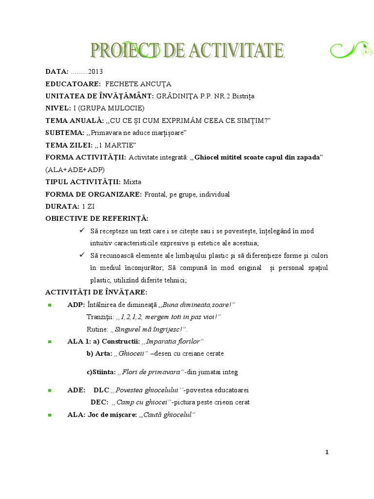 FORMA ACTIVITĂŢII: Activitate integrată: ,,Ghiocel mititel scoate capul din zapada”