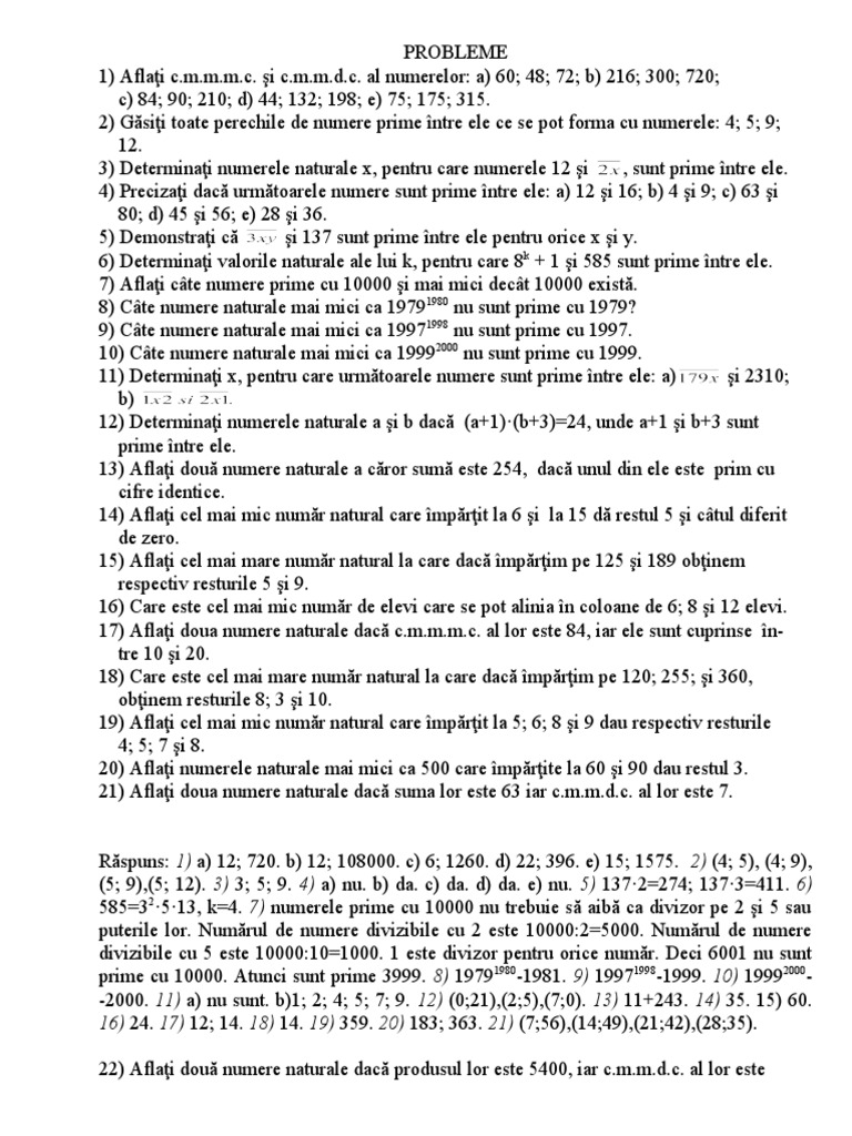 Răspuns: 1) a) 12; 720. b) 12; 108000. c) 6; 1260. d) 22; 396. e) 15; 1575. 2) (4; 5), (4; 9),