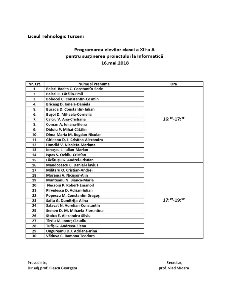 Nr. Crt. Nume și Prenume Ora