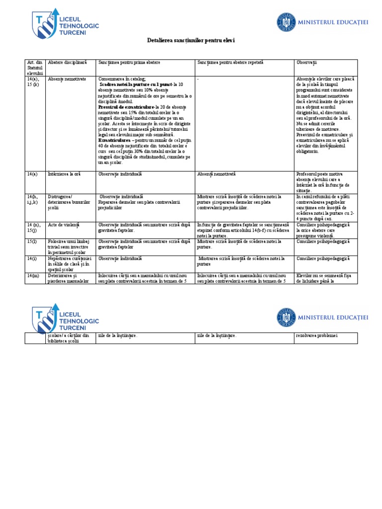 14(h, Distrugerea/ Observație individuală Mustrare scrisă însoțită de scăderea notei la În cazul refuzului de a plăti