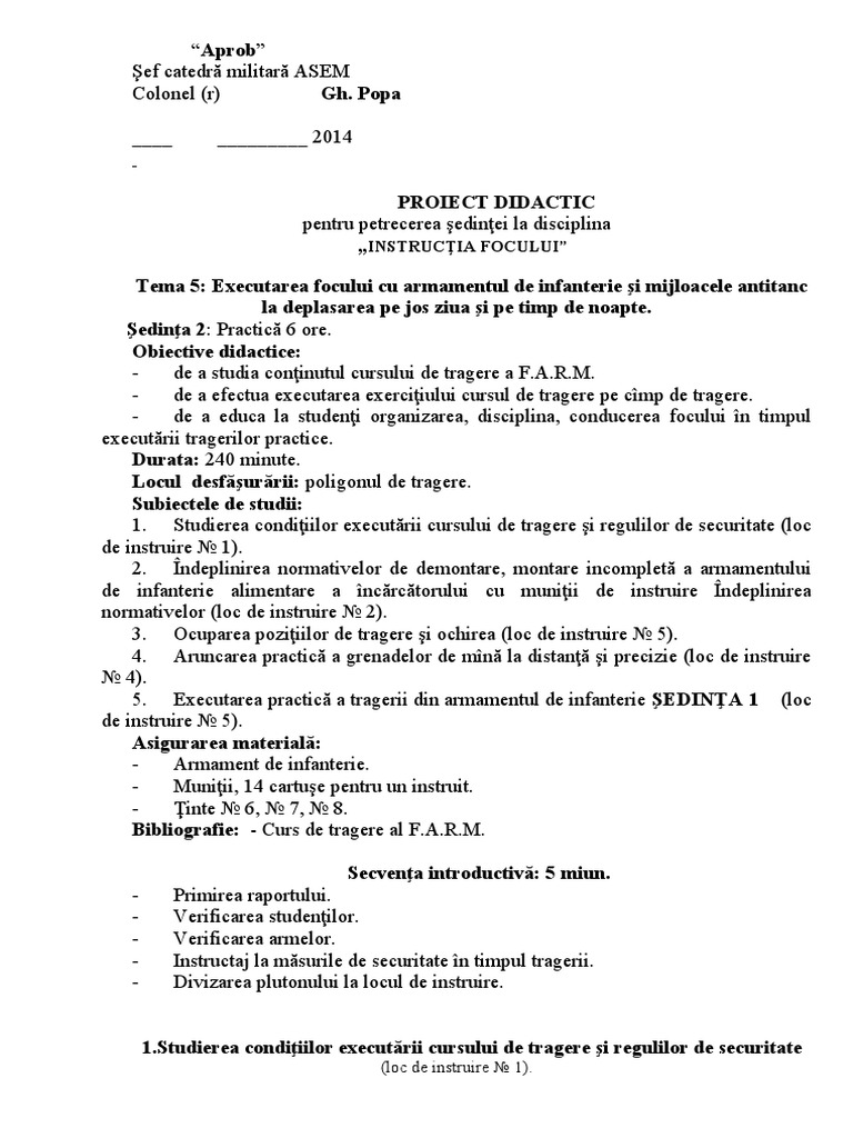 5. Executarea practică a tragerii din armamentul de infanterie ŞEDINŢA 1 (loc
