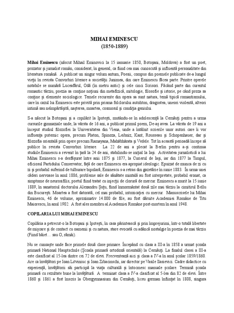 Mihai Eminescu (născut Mihail Eminovici la 15 ianuarie 1850, Botoșani, Moldova) a fost un poet,
