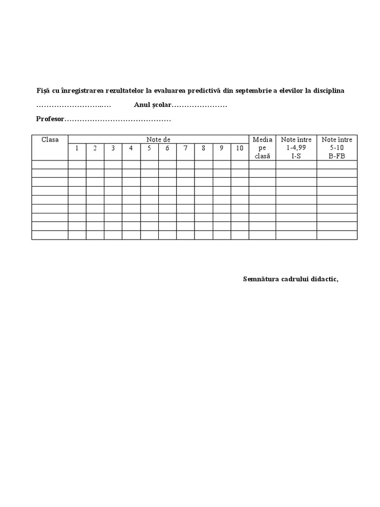 Fişă cu înregistrarea rezultatelor la evaluarea predictivă din septembrie a elevilor la disciplina