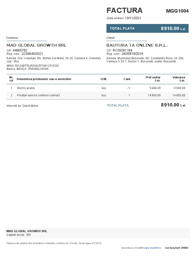 Generata cu SmartBill [Link] Cod document: D4E8X