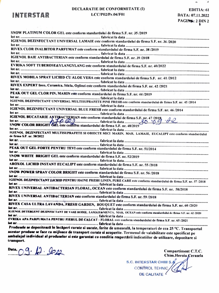 IGIENOL DETERGENT DEZINFECTANT DE VASE RODIE, LAMAIE&MENTA, MAR, OCEAN este conform standardului de firma S.F. nr. 62 /2020 **.************eeeeseeses ******