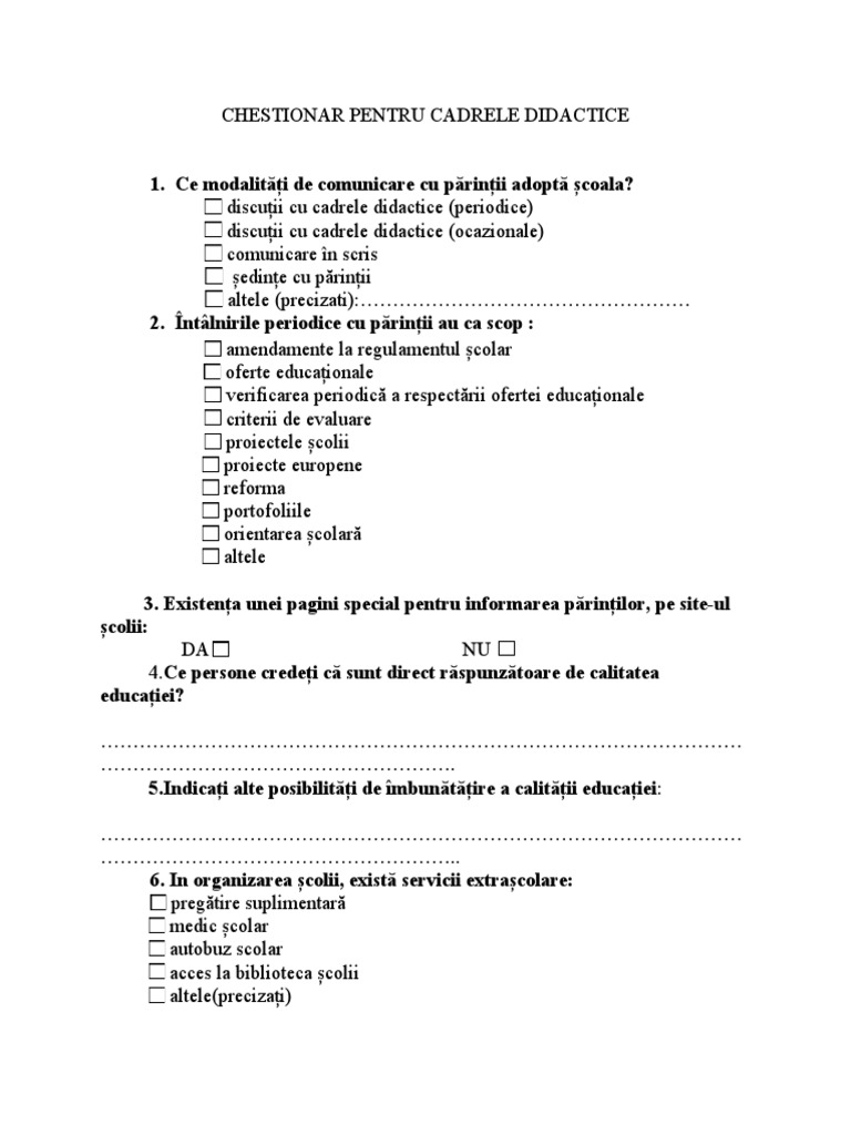 CHESTIONAR PENTRU CADRELE DIDACTICE