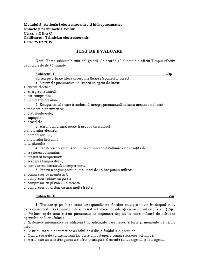 1. Sistemele pneumatice utilizează ca agent de lucru: