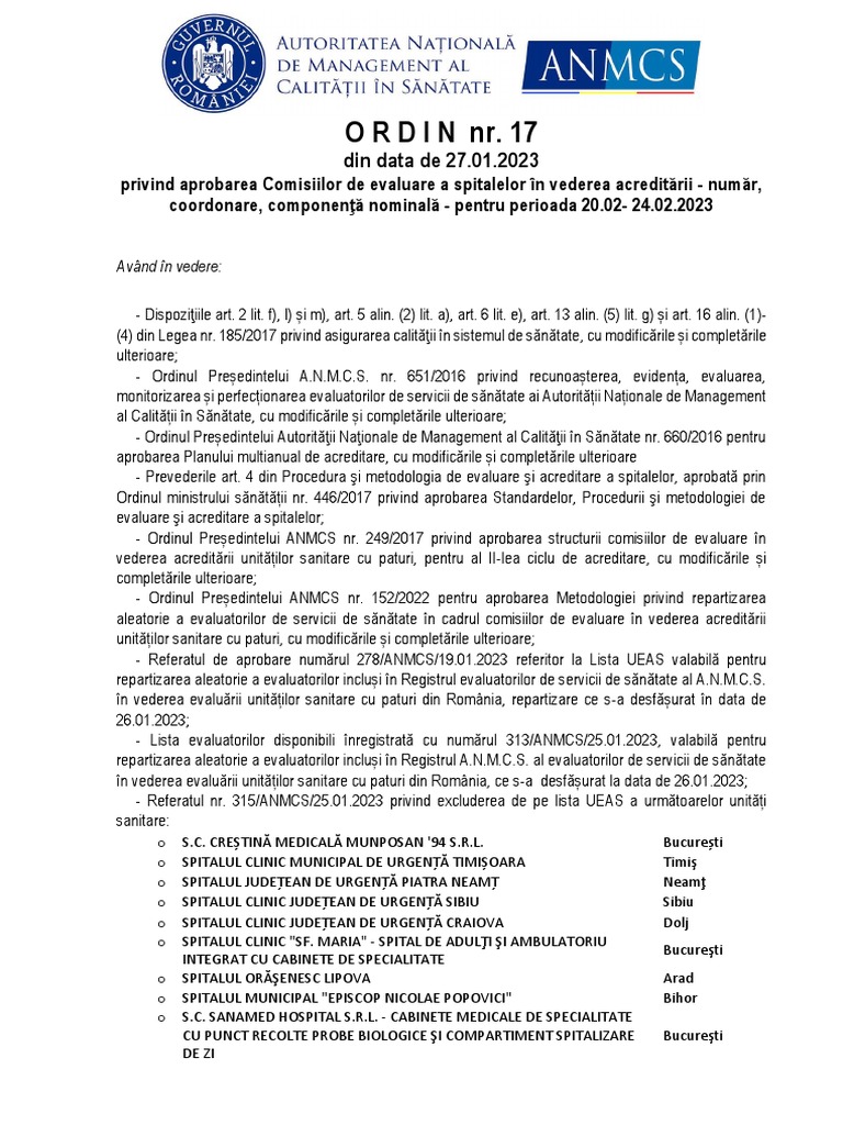 în vederea evaluării unităților sanitare cu paturi din România, ce s-a desfășurat la data de 26.01.2023;