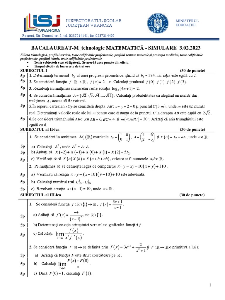 BACALAUREAT-M_tehnologic MATEMATICĂ - SIMULARE 3.02.2023