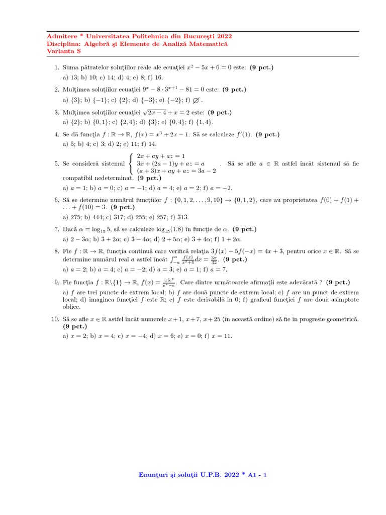 Enunţuri şi soluţii U.P.B. 2022 * A1 - 1
