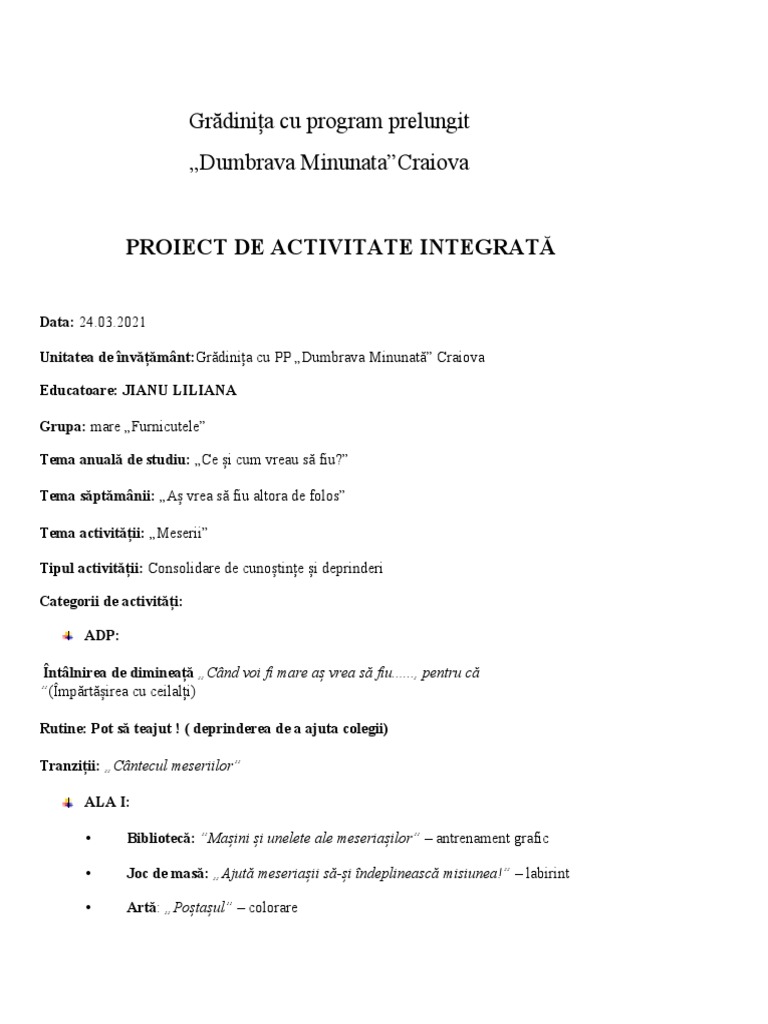 PROIECT DE ACTIVITATE INTEGRATĂ