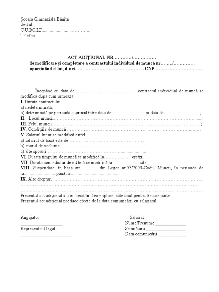 de modificare și completare a contractului individual de muncă nr……../…………..