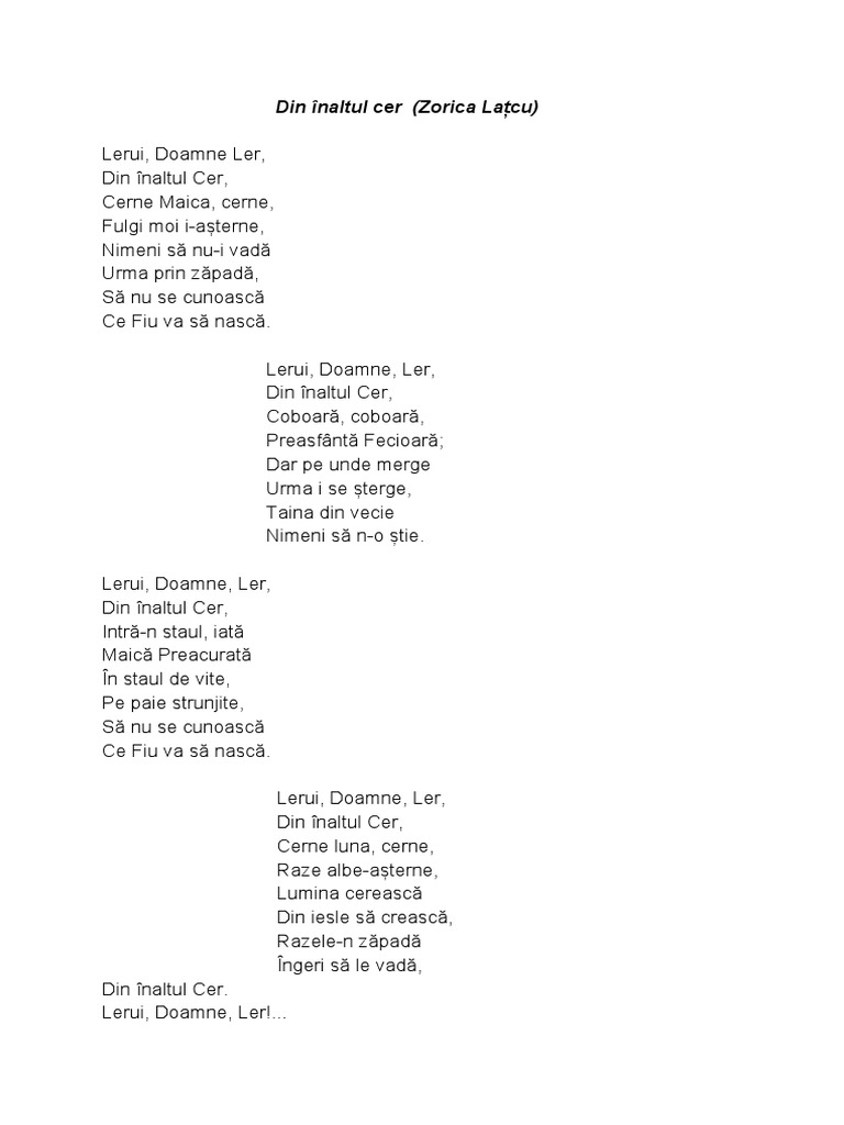 Din înaltul Cer, Cerne Maica, cerne, Fulgi moi i-așterne, Nimeni să nu-i vadă Urma prin zăpadă, Să nu se cunoască Ce Fiu va să nască.