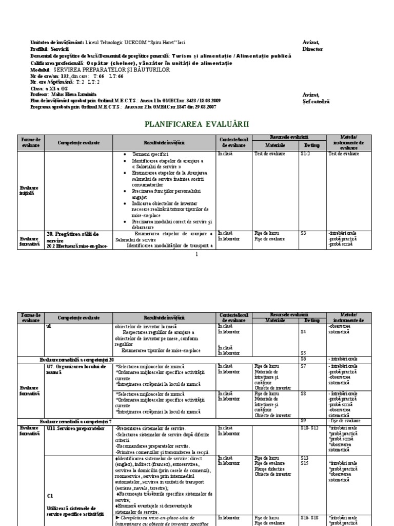 Plan de învăţământ aprobat prin Ordinul M.E.C.T.S.: Anexa 1 la OMECI nr. 3423 / 18.03.2009 Şef catedră