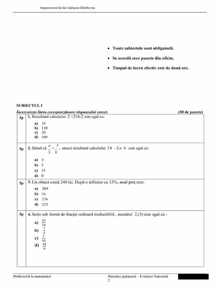 Probă scrisă la matematică Simulare județeană – Evaluare Națională Varianta 2