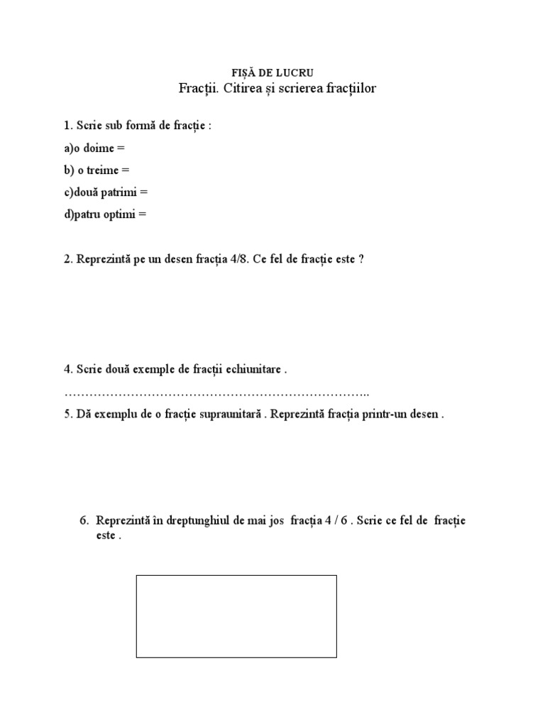 6. Reprezintă în dreptunghiul de mai jos fracția 4 / 6 . Scrie ce fel de fracție