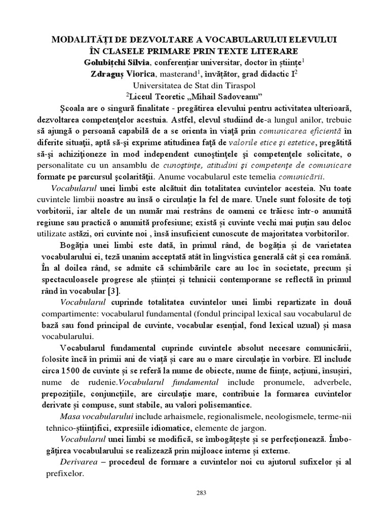 elevi, îmbogățirea vocabularului, dezvoltarea capacității de exprimare.