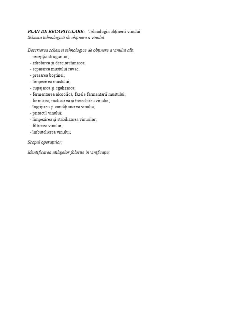 PLAN DE RECAPITULARE: Tehnologia obținerii vinului