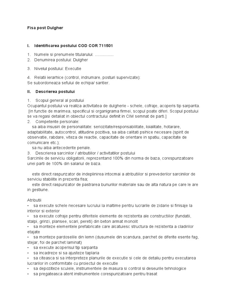 Ocupantul postului va realiza activitatea de dulgherie - schele, cofraje, acoperis tip sarpanta.
