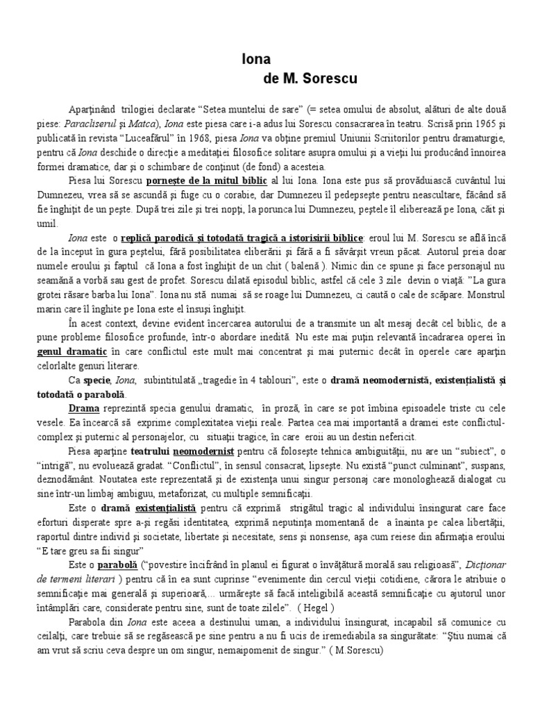 piese: Paracliserul şi Matca), Iona este piesa care i-a adus lui Sorescu consacrarea în teatru. Scrisă prin 1965 şi