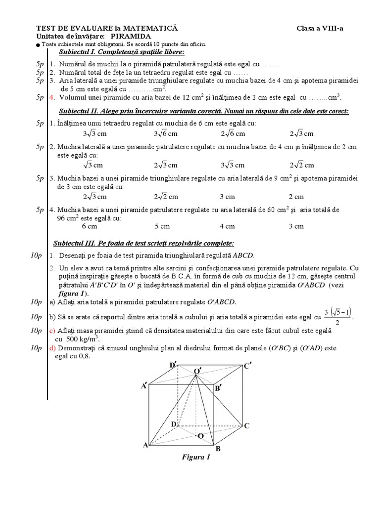 10p c) Aflaţi masa piramidei ştiind că densitatea materialului din care este făcut cubul este egală