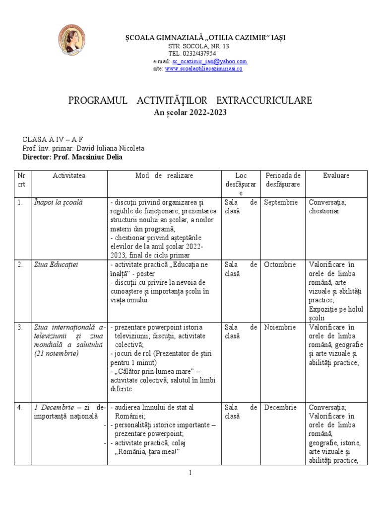 PROGRAMUL ACTIVITĂŢILOR EXTRACCURICULARE