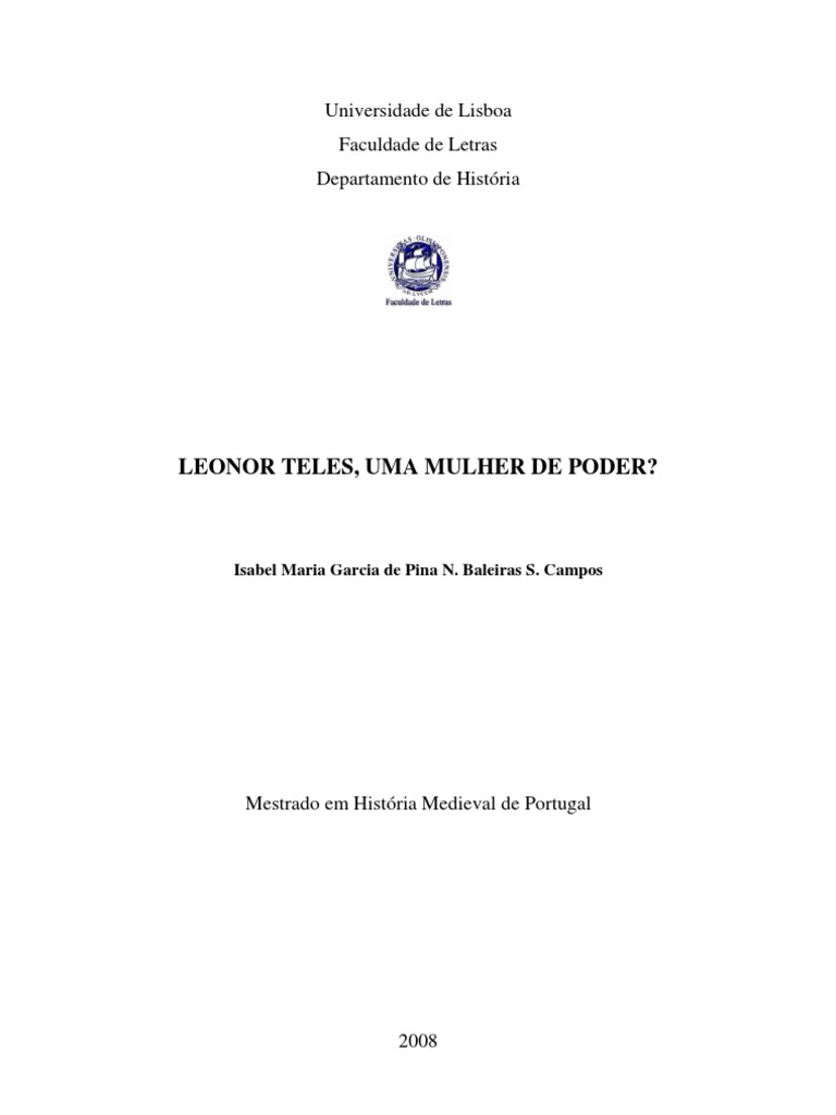 terras e o poder das rainhas por: Manuela Santos Silva, Estruturas Urbanas e Administrao Concelhia: bidos Medieval; bidos Terra que foi da Rainha D. Filipa. O Senhorio de bidos de 1415 a 1428; Os Primrdios da Casa das Rainhas de Portugal, So Martinho do Porto e a Lagoa de Alfeizero, na Idade Mdia (este ltimo, em parceria com Iria Gonalves), entre outros; Ana Maria Rodrigues, Torres Vedras, a Vila e o Termo nos Finais da Idade Mdia; "Rainhas Medievais de Portugal: funes, patrimnios, poderes"; The Queen Consort in Late-Medieval Portugal; For the Honor of Her Lineage and Body: the Dowers and Dowries of Some Late Medieval Queens of Portugal; Hermnia Vasconcelos Vilar, Abrantes Medieval sculos XIV-XV; Joo Pedro Ferro, Alenquer Medieval (sculos XII-XV), subsdios para o seu estudo; Judite de Freitas, D. Leonor de Arago: imagens de contestao e de poder; Isabel de Barros Dias, Uso pragmtico do topos da rainha m na segunda edio da Crnica de 1344; Maria do Carmo Castelo Branco de Sequeira, Seduo e Malcia (a propsito de duas mulheres do imaginrio portugus a Ribeirinha e Leonor Teles; Ana Paula Sousa, Leonor Teles Huuma Maa Molher?; Maria Manuela Ferreira dos Santos Vicente, Rainha, Paradigma de Mulher (Idade Mdia portuguesa); Ana Rodrigues de Oliveira, As Representaes da Mulher na Cronstica Medieval Portuguesa (scs. XII a XIV); Manuel Marques Duarte, Leonor Teles. A propsito do casamento medieval, pesquismos o trabalho conjunto de Bresc, Cuvillier, Fossier, Guichard, Toubert, La Famille Occidentale au Moyen Age; os livros de Christopher Brooke, The Medieval Idea of Marriage e de Diddier Lett, Famille et Parent dans lOccident Mdival V-XV Sicle. Para melhor situarmos e compreendermos a obra de Ferno Lopes, consultmos: Teresa Amado, Ferno Lopes, contador de Histria, sobre a Crnica de D. Joo I; Maria ngela Beirante, As Estruturas Sociais em Ferno Lopes; Joo Gouveia Monteiro, Ferno Lopes, Texto e Contexto; Lus de Sousa Rebelo, A Concepo de Poder em Ferno Lopes. Nas questes sobre genealogia encontrmos respostas em Anselmo Brancamp Freire, Brases da Sala de Sintra; Maria de Lurdes Rosa, Alianas Matrimoniais e Estruturao da linhagem na Alta Nobreza: os Teles de Meneses, scs. XII-XIV; Bernardo Vasconcelos e Sousa, Os Pimentis, Percursos de uma Linhagem da Nobreza Medieval Portuguesa (sculos XIII-XIV). Para o estudo de Leonor, em Castela, lemos, essencialmente, as fontes seiscentistas e setecentistas como Juan Antolnez de Burgos (Historia de N.N.y S.L. 11