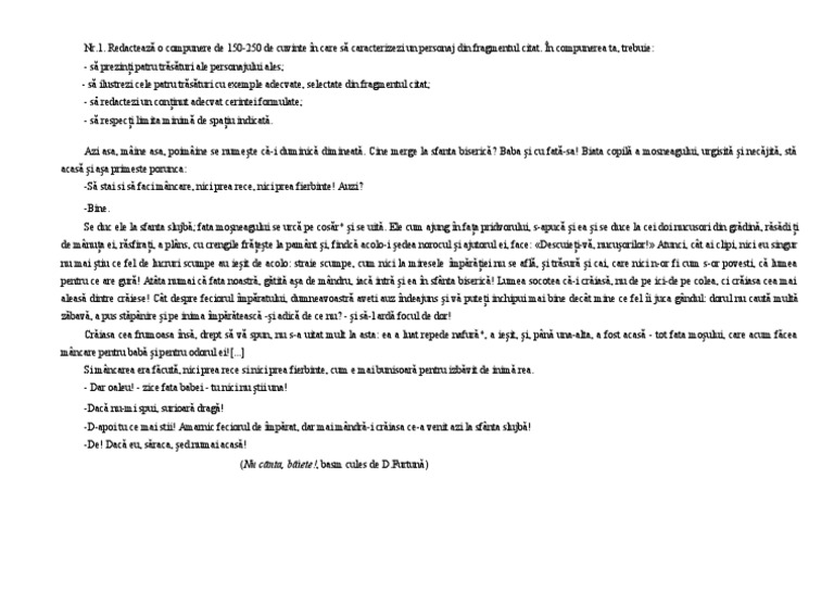 Nr.1. Redactează o compunere de 150-250 de cuvinte în care să caracterizezi un personaj din fragmentul citat.