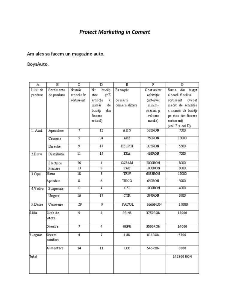 Linii de Sortimente Număr Nr bucăți Exemple Cost unitar Suma din buget