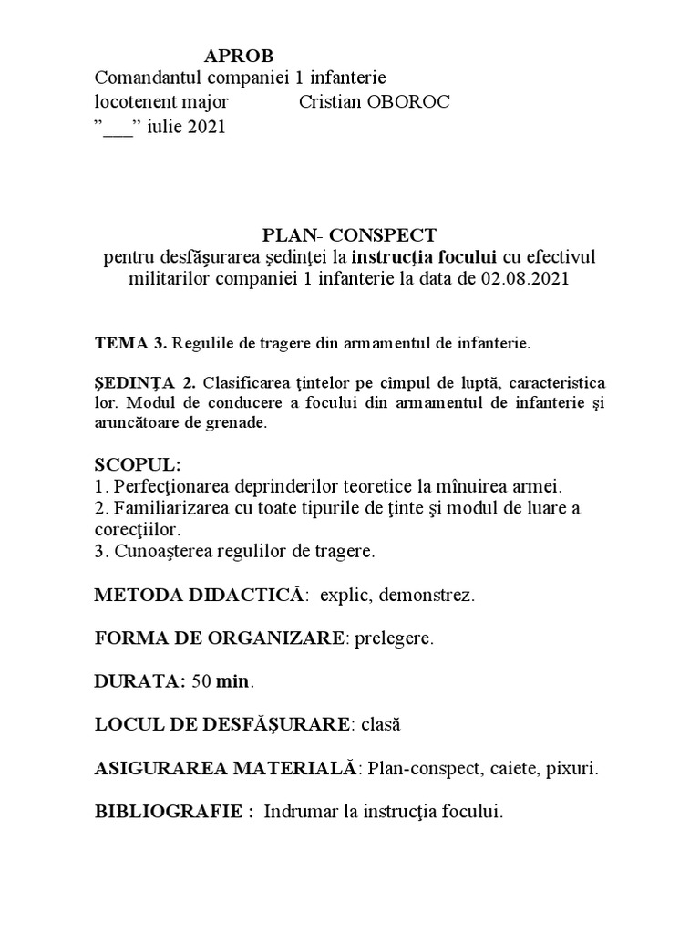 pentru desfășurarea şedinţei la instrucţia focului cu efectivul