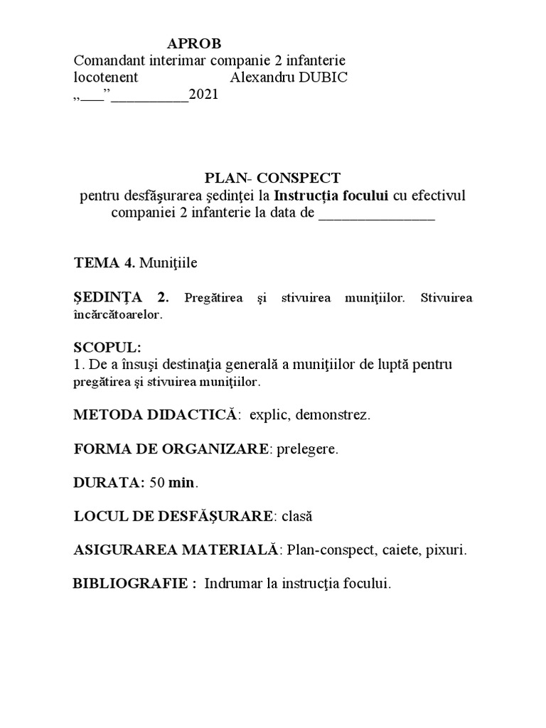 pentru desfășurarea şedinţei la Instrucția focului cu efectivul
