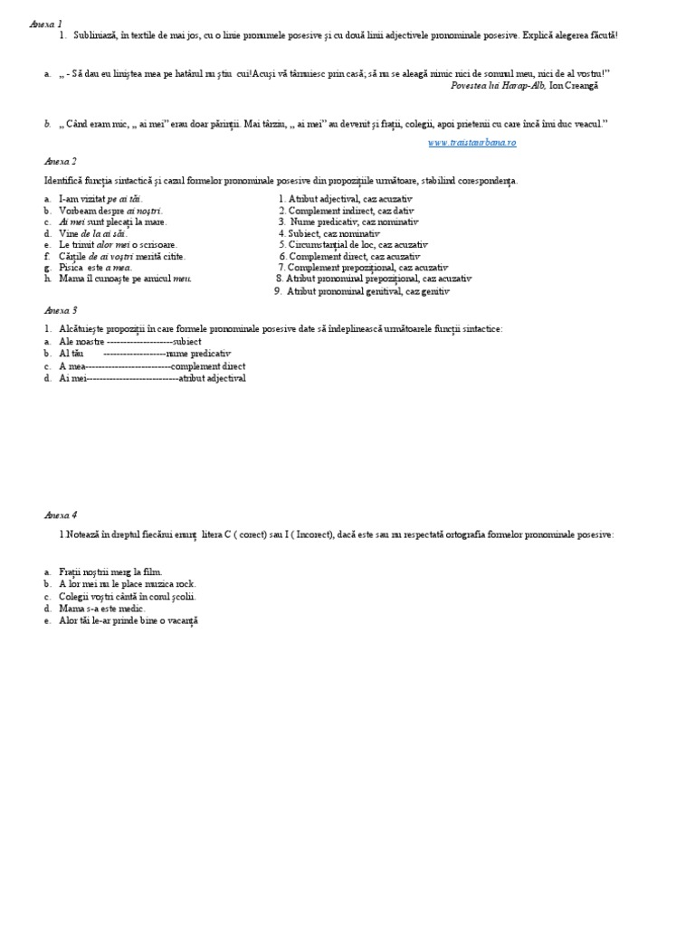 1. Alcătuiește propoziții în care formele pronominale posesive date să îndeplinească următoarele funcții sintactice: