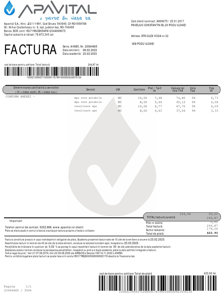 Telefon centrul de contact: 0232.969, [Link]/clienti Total facturã: 244,87
