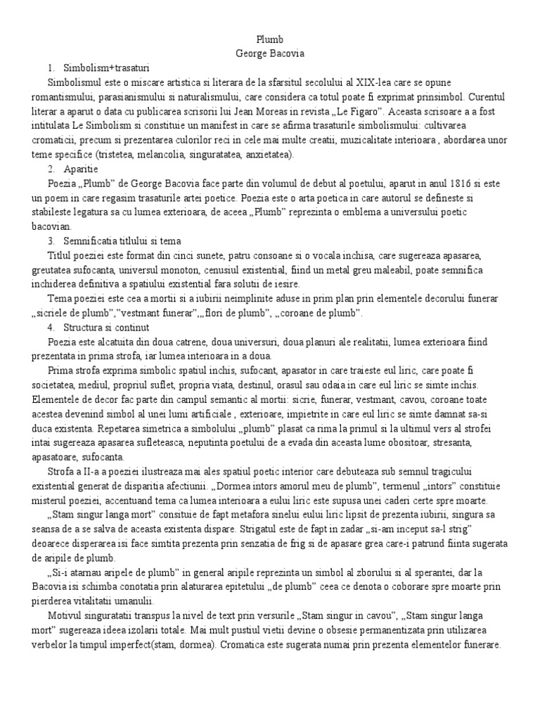 Poezia „Plumb” de George Bacovia face parte din volumul de debut al poetului, aparut in anul 1816 si este