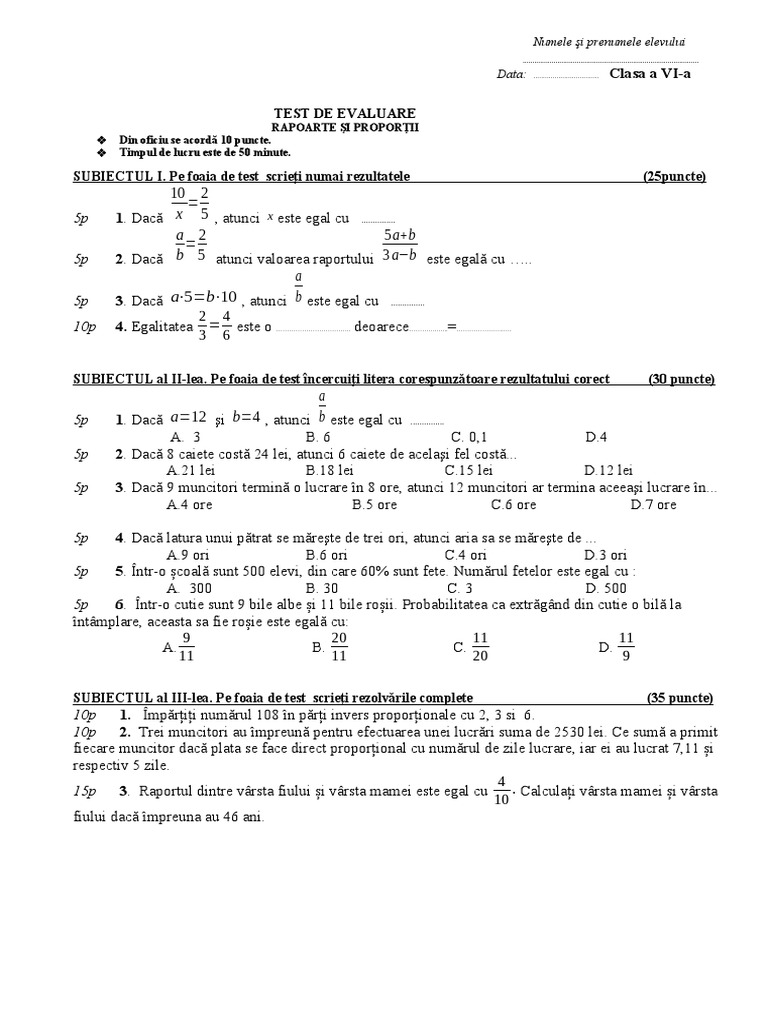 5p 2. Dacă b 5 atunci valoarea raportului 3 a−b este egală cu …..